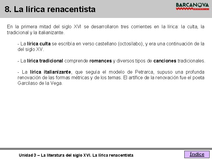 8. La lírica renacentista En la primera mitad del siglo XVI se desarrollaron tres corrientes en la lírica: la culta, la tradicional y la italianizante. - La lírica culta se escribía en verso castellano (octosílabo), y era una continuación de la del siglo XV. - La lírica tradicional comprende romances y diversos tipos de canciones tradicionales. - La lírica italianizante, que seguía el modelo de Petrarca, supuso una profunda renovación de las formas métricas y de los temas. El artífice de la renovación fue el poeta Garcilaso de la Vega. Unidad 3 – La literatura del siglo XVI. La lírica renacentista Índice