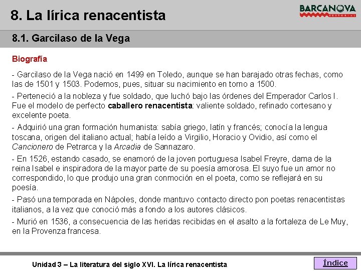 8. La lírica renacentista 8. 1. Garcilaso de la Vega Biografía - Garcilaso de la Vega nació en 1499 en Toledo, aunque se han barajado otras fechas, como las de 1501 y 1503. Podemos, pues, situar su nacimiento en torno a 1500. - Perteneció a la nobleza y fue soldado, que luchó bajo las órdenes del Emperador Carlos I. Fue el modelo de perfecto caballero renacentista: valiente soldado, refinado cortesano y excelente poeta. - Adquirió una gran formación humanista: sabía griego, latín y francés; conocía la lengua toscana, origen del italiano actual; había leído a Virgilio, Horacio y Ovidio, así como el Cancionero de Petrarca y la Arcadia de Sannazaro. - En 1526, estando casado, se enamoró de la joven portuguesa Isabel Freyre, dama de la reina Isabel e inspiradora de la mayor parte de su poesía amorosa. El suyo fue un amor no correspondido, lo que produjo una gran conmoción en el poeta, como se reflejará en su poesía. - Pasó una temporada en Nápoles, donde mantuvo contacto directo pon poetas renacentistas italianos, a la vez que conoció más a fondo a los autores clásicos. - Murió en 1536, a consecuencia de las heridas recibidas en el asalto a la fortaleza de Le Muy, en la Provenza francesa. Unidad 3 – La literatura del siglo XVI. La lírica renacentista Índice