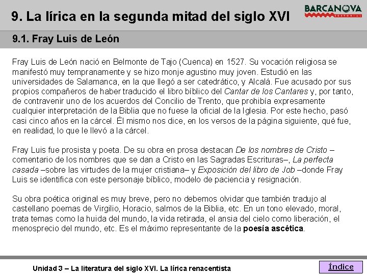9. La lírica en la segunda mitad del siglo XVI 9. 1. Fray Luis de León nació en Belmonte de Tajo (Cuenca) en 1527. Su vocación religiosa se manifestó muy tempranamente y se hizo monje agustino muy joven. Estudió en las universidades de Salamanca, en la que llegó a ser catedrático, y Alcalá. Fue acusado por sus propios compañeros de haber traducido el libro bíblico del Cantar de los Cantares y, por tanto, de contravenir uno de los acuerdos del Concilio de Trento, que prohibía expresamente cualquier interpretación de la Biblia que no fuese la oficial de la Iglesia. Por este hecho, pasó casi cinco años en la cárcel. Él mismo nos dice, en los versos de la página siguiente, qué fue, en realidad, lo que le llevó a la cárcel. Fray Luis fue prosista y poeta. De su obra en prosa destacan De los nombres de Cristo – comentario de los nombres que se dan a Cristo en las Sagradas Escrituras–, La perfecta casada –sobre las virtudes de la mujer cristiana– y Exposición del libro de Job –donde Fray Luis se identifica con este personaje bíblico, modelo de paciencia y resignación. Su obra poética original es muy breve, pero no debemos olvidar que también tradujo al castellano poemas de Virgilio, Horacio, salmos de la Biblia, etc. En un tono elevado, moral, trata temas como la huida del mundo, la vida retirada, el ansia del cielo como liberación, el menosprecio del mundo, etc. Es el máximo representante de la poesía ascética. Unidad 3 – La literatura del siglo XVI. La lírica renacentista Índice