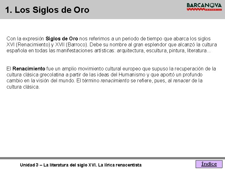 La literatura del siglo XVI. La lírica renacentista 1. Los Siglos de Oro 2. Contexto histórico 3. La sociedad española del siglo XVI 4. La cultura renacentista 5. Temas de la literatura renacentista 6. Géneros de la literatura renacentista 7. Lengua y estilo 8. La lírica renacentista 9. La lírica en la segunda mitad del siglo XVI Unidad 3 – La literatura del siglo XVI. La lírica renacentista