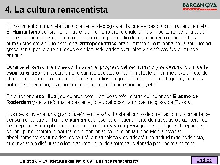 4. La cultura renacentista El movimiento humanista fue la corriente ideológica en la que se basó la cultura renacentista. El Humanismo consideraba que el ser humano era la criatura más importante de la creación, capaz de controlar y de dominar la naturaleza por medio del conocimiento racional. Los humanistas creían que este ideal antropocéntrico era el mismo que reinaba en la antigüedad grecolatina, por lo que su modelo en las actividades culturales y científicas fue el mundo antiguo. Durante el Renacimiento se confiaba en el progreso del ser humano y se desarrolló un fuerte espíritu crítico, en oposición a la sumisa aceptación del inmutable orden medieval. Fruto de ello fue un avance considerable en los estudios de geografía, náutica, cartografía, ciencias naturales, medicina, astronomía, teología, derecho internacional, etc. En el terreno espiritual, se dejaron sentir las ideas reformistas del holandés Erasmo de Rotterdam y de la reforma protestante, que acabó con la unidad religiosa de Europa. Sus ideas tuvieron una gran difusión en España, hasta el punto de que nació una corriente de pensamiento que se llamó erasmismo, presente en buena parte de nuestras obras literarias de la época. Ello explica, en gran medida, la crisis religiosa que se produjo en la época: se separó por completo lo natural de lo sobrenatural, que en la Edad Media estaban absolutamente confundidos, se exaltó la naturaleza y se adoptó una actitud más hedonista, que invitaba a disfrutar de los placeres de la vida terrenal, valorada por encima de todo. Unidad 3 – La literatura del siglo XVI. La lírica renacentista Índice