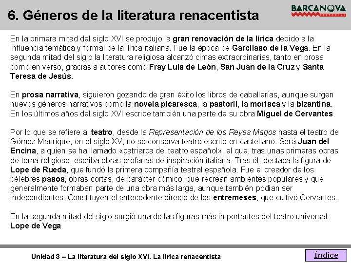 6. Géneros de la literatura renacentista En la primera mitad del siglo XVI se produjo la gran renovación de la lírica debido a la influencia temática y formal de la lírica italiana. Fue la época de Garcilaso de la Vega. En la segunda mitad del siglo la literatura religiosa alcanzó cimas extraordinarias, tanto en prosa como en verso, gracias a autores como Fray Luis de León, San Juan de la Cruz y Santa Teresa de Jesús. En prosa narrativa, siguieron gozando de gran éxito los libros de caballerías, aunque surgen nuevos géneros narrativos como la novela picaresca, la pastoril, la morisca y la bizantina. En los últimos años del siglo XVI escribe también una parte de su obra Miguel de Cervantes. Por lo que se refiere al teatro, desde la Representación de los Reyes Magos hasta el teatro de Gómez Manrique, en el siglo XV, no se conserva teatro escrito en castellano. Será Juan del Encina, a quien se ha llamado «patriarca del teatro español» , el que, tras unas primeras obras de tema religioso, escriba obras profanas de inspiración italiana. Tras él, destaca la figura de Lope de Rueda, que fundó la primera compañía teatral española. Fue el creador de los célebres pasos, obras cortas, de carácter cómico, que recrean ambientes populares y que generalmente formaban parte de una obra más larga, aunque también podían ser independientes. Constituyen el antecedente directo de los entremeses, que cultivó Cervantes. En la segunda mitad del siglo surgió una de las figuras más importantes del teatro universal: Lope de Vega. Unidad 3 – La literatura del siglo XVI. La lírica renacentista Índice