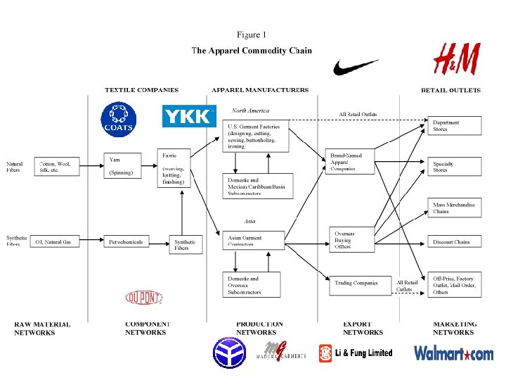 La producción mundial y la cadena de valor en el sector de la confección Logística Materias primas Procesamiento Redes de componentes Ensamblaje Redes de exportación Redes de venta minorista Basado en G. Gereffi 2001