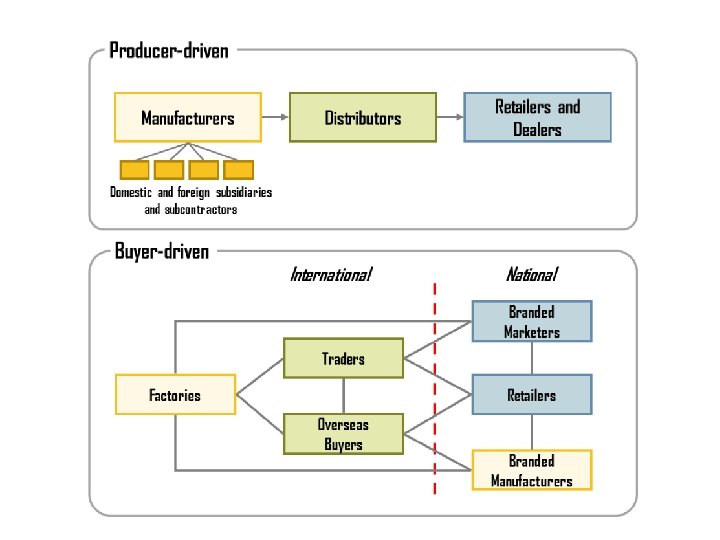 Tipos de cadena de valor • Impulsadas por los compradores: minoristas mundiales, las marcas mundiales ostentan el poder comercial en sectores como el del juguete, la ropa, la agricultura y los bienes de consumo. • Impulsadas por los productores: automóviles, aeronáutica. • Impulsadas por internet: Comercio electrónico.