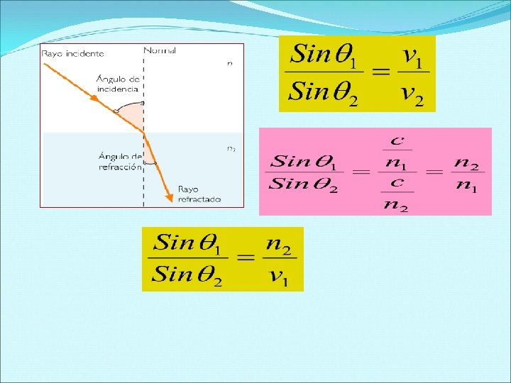 La refracción de la luz Se denomina refracción luminosa al cambio que experimenta la dirección de propagación de la luz cuando atraviesa oblicuamente la superficie de separación de dos medios transparentes de distinta naturaleza. Las lentes, las máquinas fotográficas, el ojo humano y, en general, la mayor parte de los instrumentos ópticos basan su funcionamiento en este fenómeno óptico. Las leyes de la refracción Sean 1 y 2 dos medios transparentes en contacto que son atravesados por un rayo luminoso en el sentido de 1 a. Las leyes que rigen el fenómeno de la refracción pueden, entonces, expresarse en la forma: 1. ª Ley. El rayo incidente, la normal y el rayo refractado se encuentran en el mismo plano. 2. ª Ley. (ley de Snell) Los senos de los ángulos de incidencia y de refracción son directamente proporcionales a las velocidades de propagación v 1 y v 2 de la luz en los respectivos medios.