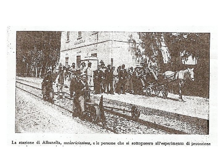 1900, Stazione di Albanella - Le persone che si sottoposero all’esperimento di protezione contro le zanzare (viso coperto da un velo collocato intorno al cappello e le mani protette da un paio di guanti di cotone a maglia molto stretta), proposto dal prof. Giovanni Battista Grassi, dell’Università di Roma, che, con due impiegati ferroviari, su una sorta di veicolo detto “triciclo”, va dall’uno all’altro dei caselli ferroviari protetti.