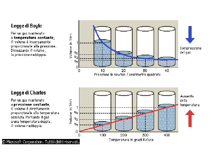 • • Nel 1661 lo scienziato irlandese Robert Boyle diede un importante contributo alla chimica formulando la legge secondo cui, in trasformazioni isoterme (a temperatura costante), il volume e la pressione di un gas sono inversamente proporzionali: • Legge di Boyle (isoterma, cioè a T costante) (PV)T = K Circa un secolo più tardi il fisico francese Jacques-Alexandre Charles stabilì che, in trasformazioni isobare (a pressione costante), il volume è direttamente proporzionale alla temperatura: • Legge di Charles-Gay Lussac (isobara, cioè a P costante) (V)p = Vo (1+aot) in cui: V 0 è il volume occupato a 0°C; a 0 = 1/273. 15; t, temperatura, è espressa in °C. Se poniamo t = -273. 15, allora V = 0. Tale t è presa come punto di zero della scala assoluta, cioè -273. 15°C, corrispondente a 0 K (Kelvin). • • Principio di Avogadro: volumi eguali di gas diversi, alle stesse T e P, contengono lo stesso numero di particelle. Perciò il volume di un gas può essere usato come misura della quantità, poiché è proporzionale al numero di moli di gas. La legge generale dei gas si applica correttamente solo al gas ideale o perfetto, costituito di particelle tutte uguali, con la stessa massa e con volume nullo (puntiformi): è un modello che è stato costruito per razionalizzare il comportamento dei gas.