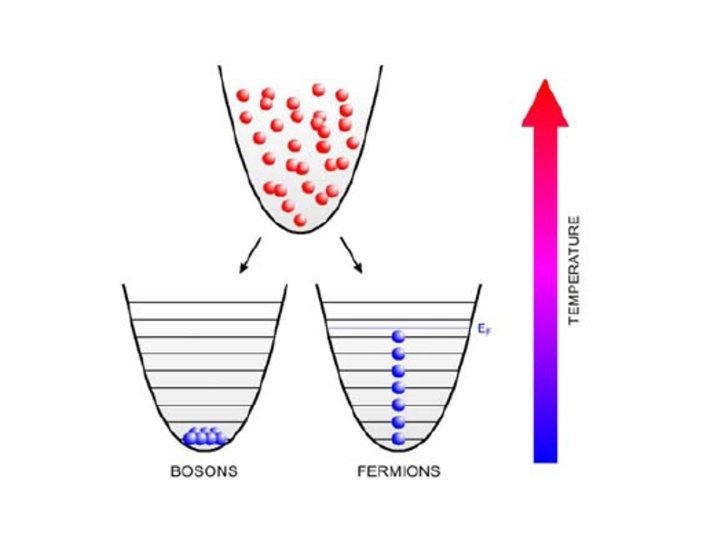 • • In condizioni normali infatti gli atomi si trovano in vari livelli energetici, ma a temperature sufficientemente basse il comportamento si differenzia, a seconda se gli atomi appartengono alla categoria dei bosoni o a quella dei fermioni. Mentre i fermioni obbediscono al principio di esclusione di Pauli, si differenziano su vari livelli e non possono creare condensati, le assemblee ( termine che sta ad indicare le particelle disposte e raggruppate) di bosoni (l'esempio più classico è l'assemblea di fotoni) non sono vincolate dal fatto che solo una particella può occupare un dato stato quantico. Per questo tendono ad accumularsi nello stato quantistico fondamentale. Più la temperatura è bassa, più è grande l'accumulo verso lo stato fondamentale: perdono la loro individualità per dare luogo a un comportamento "coerente", formando una specie di "superatomo" che appare come una singola entità. Questo dà per altro luogo a fenomeni interessanti, come la superfluidità Tuttatvia coppie di fermioni possono accoppiarsi in bosoni, che possono condensare. Un atomo con particelle pari puo` quindi aggregarsi in condensati. Un condensato pero` per la particolare situazione in cui esiste e` molto difficile da mantenere e generalmente dopo poco tempo le particelle si aggregano in altro modo.