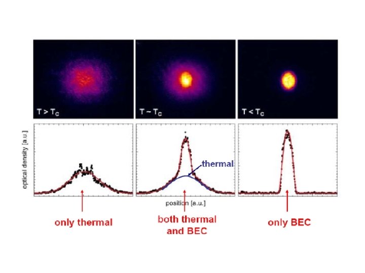 • • The false colors indicate the number of atoms at each velocity, with red being the fewest and white being the most. The areas appearing white and light blue are at the lowest velocities. Left: just before the appearance of the Bose–Einstein condensate (400 n. K). Center: just after the appearance of the condensate (200 n. K). Right: after further evaporation, leaving a sample of nearly pure condensate (50 n. K). The peak is not infinitely narrow because of the Heisenberg uncertainty principle: since the atoms are trapped in a particular region of space, their velocity distribution necessarily possesses a certain minimum width (ampiezza).