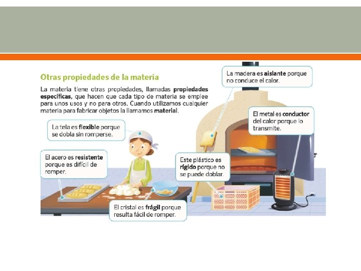 MATERIALES La materia que usamos para hacer objetos se llama Material. Cada material tiene Una serie de propiedades que los diferencian unos de otros. Propiedades de los materiales Impermeabilidad Un material impermeable no permite que un líquido lo traspase. Un material permeable permite que el líquido lo traspase Elasticidad Un material elástico vuelve a su forma original después de doblarlo. Un material maleable cambia su forma Transparencia Un material transparente permite que la luz pase a través de él. Un material opaco no permite que la luz lo traspase Fuerza Un material fuerte es difícil de romper. Un material frágil se rompe fácilmente