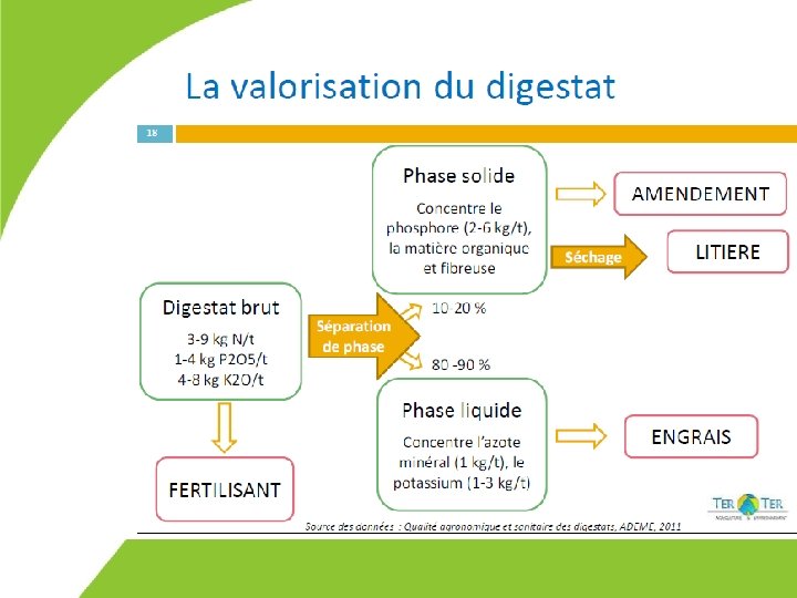 Une unité de méthanisation – ‘voie liquide’ Hydrolyse Digesteur Préparation incorporation Silos stockage Digestat fraction solide après séparation de phase Source ESETA