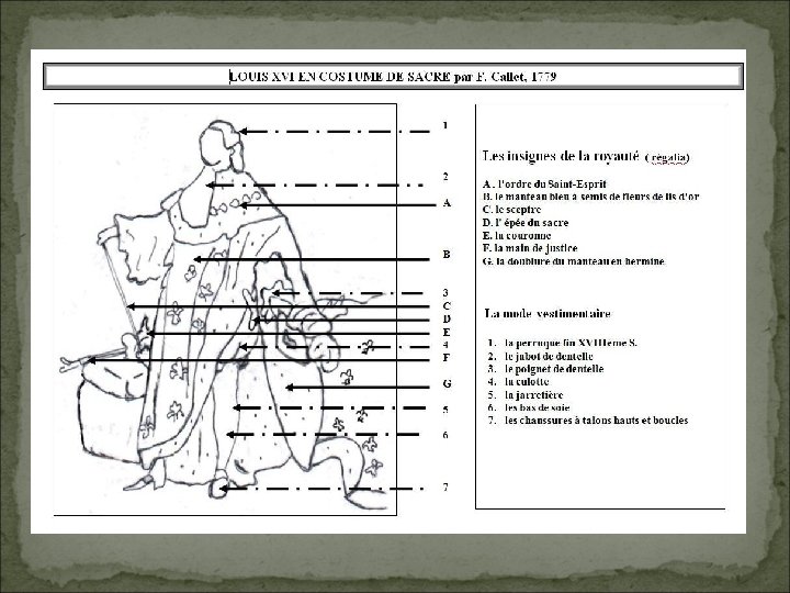 les symboles royaux du sacre Les insignes de la royauté ( régalia) A. l'ordre du Saint-Esprit B. le manteau bleu à semis de fleurs de lis d'or C. le sceptre D. l'épée du sacre E. la couronne F. la main de justice G. la doublure du manteau en hermine