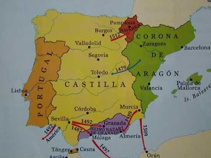 n Ø Ø Ø 1. La conquesta de nous territoris Regne de Granada Regne de Navarra (1512) Les Illes Canàries Les Índies (Amèrica): 12 d'octubre de 1492 Cristóbal Colón arriba a Amèrica. Melilla (conquistada 1497). Altres ciutats costaneres del nord d'Àfrica com Orà, Trípoli, Ceuta