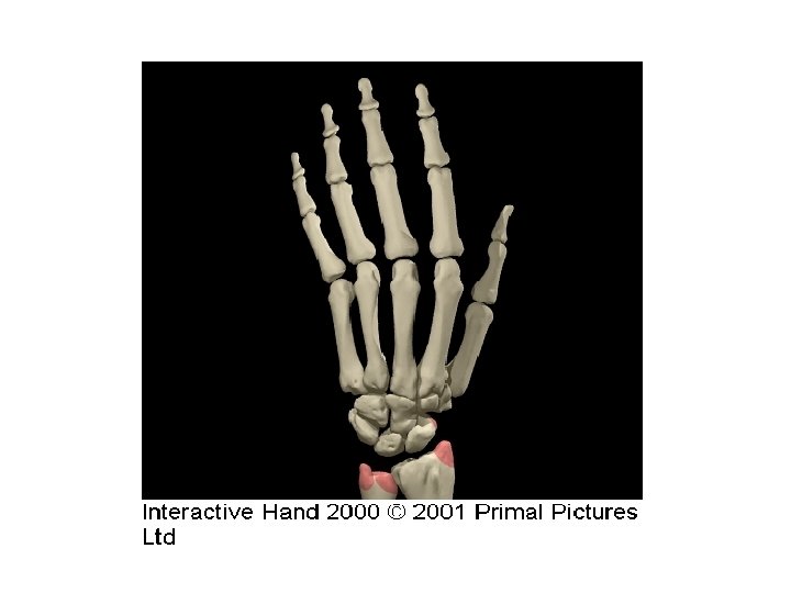 HUESOS DE LA MANO • Hay cinco huesos en la mano conocidos como metacarpianos. El metacarpiano del pulgar es conocido como el primer metacarpiano, el segundo metacarpiano es el dedo índice, el tercer metacarpiano es el dedo medio, el cuarto metacarpiano el dedo anular y el quinto metacarpiano es el del meñique. • Distales a los huesos metacarpianos están las falanges. El pulgar tiene dos falanges (proximal y distal), los otros cuatro dedos tienen tres falanges: proximal, media y distal