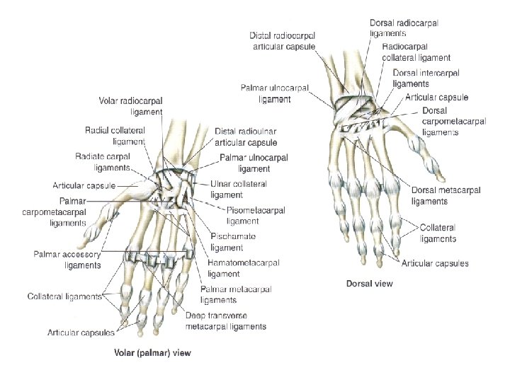LIGAMENTOS DE LAS ARTICULACIONES INTERCARPIANAS • Ligamentos intercarpianos de la fila proximal: Conectan la fila proximal de los huesos del carpo. • Ligamentos intercarpianos de la fila distal: Conectan la fila distal de los huesos del carpo • Ligamentos intercarpianos próximo-distales: Conectan los huesos del carpo de la fila proximal y distal. • Estos ligamentos pueden ser divididos uno a uno por su nombre de unión: palmares, dorsales, interóseos, pisohamatal, pisometcarpal, etc… Para la intención del curso, basta conocerlos en sus tres grandes divisiones.