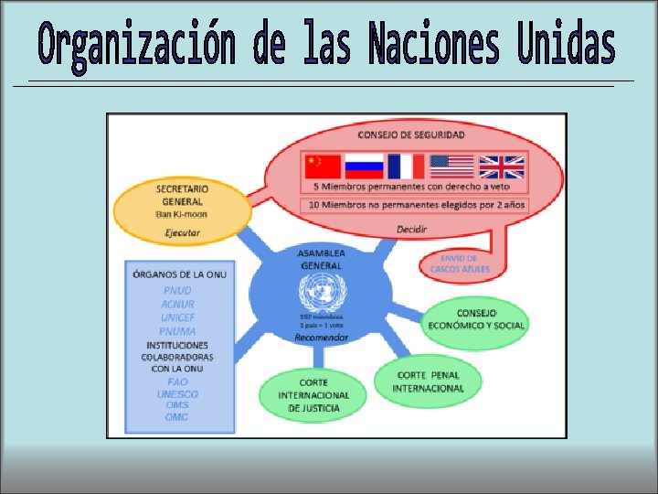 1. - El Consejo de Seguridad: es un órgano esencial dentro de la ONU. Posee once miembros, se fundó con cinco permanentes: China Nacionalista, Estados Unidos, Francia Gran Bretaña y la URSS. Las decisiones del consejo se toman por mayorías simples y en asuntos decisivos es necesaria la aprobación de los miembros permanentes. En sus inicios estaba encargado del mantenimiento de la paz y seguridad internacional. Por la magnitud de las decisiones que estas funciones pueden implicar (envío de los Cascos Azules), se acordó posteriormente que en estos asuntos recibiera el apoyo de la Asamblea General.