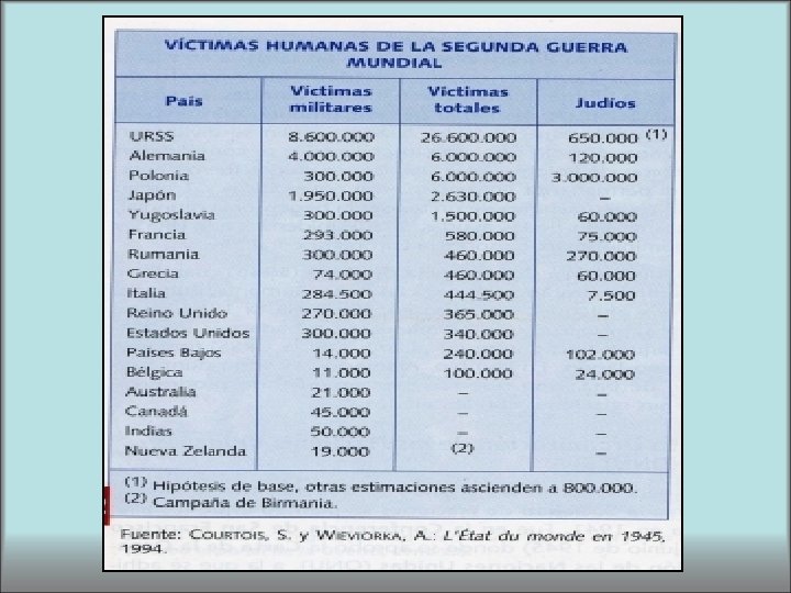 Sin embargo, algunas estadísticas pueden incluso con toda su aridez ofrecernos un esquema: la estimación del número de muertos como consecuencia del conflicto oscila entre los 25 y 40 millones; en cambio la Primera Guerra Mundial sólo había costado 10 millones de vidas…