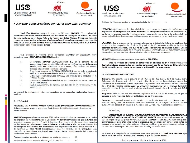 Ejemplo de Conciliación Un trabajador es despedido y no está de acuerdo con esta decisión. El empresario lo cita para recoger el finiquito y la carta de despido. La carta de despido se firma como "no conforme“. No implica nada salvo que se habilita la posibilidad de acudir al acto de conciliación. El trabajador debe acudir a un abogado, bien de los sindicatos o bien otro, que aconsejará para el resto del proceso. Normalmente se llevan una comisión de lo que se obtenga tras la conciliación o el juicio (Asociación de Mediación en Murcia-Sindicatos). Conciliación: es un requisito previo para la tramitación de cualquier procedimiento por despido ante el Juzgado de lo Social. El abogado presentará una demanda de conciliación ante la Unidad de Mediación, Arbitraje y Conciliación ante el órgano que asuma estas funciones. Hay acuerdo: lo acordado en conciliación tendrá fuerza ejecutiva entre las partes intervinientes sin necesidad de ratificación ante el Juez o Tribunal. Si no hay acuerdo: el trabajador (abogado) presentara una demanda ante el Juzgado de lo Social, aportando el justificante del resultado del acto de conciliación.