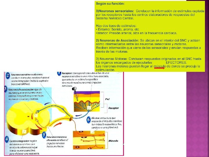 Neuronas sensoriales: las cuales son receptoras y conducen información al SNC. Neuronas motoras: conducen información del SNC hacia los músculos efectores. Interneuronas: unen a dos o más neuronas. Neuronas según su función