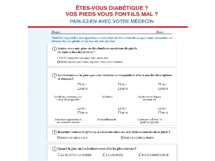 Questionnaires • 3 ressortent de la littérature (Niveau A, Class I) DN 4 : douleur neuropathique en 4 questions Pain. DETECT LANSS : Leeds Assessment of Neuropathic Symptoms and Signs