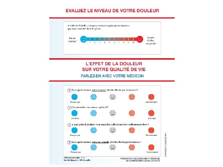 Diagnostic • Poser les bonnes questions…. ATCDs Anamnèse précise sur les douleurs Questionnaires pour un screening vs diagnostic? Quantifier la douleur (Visual Analogic Scale)
