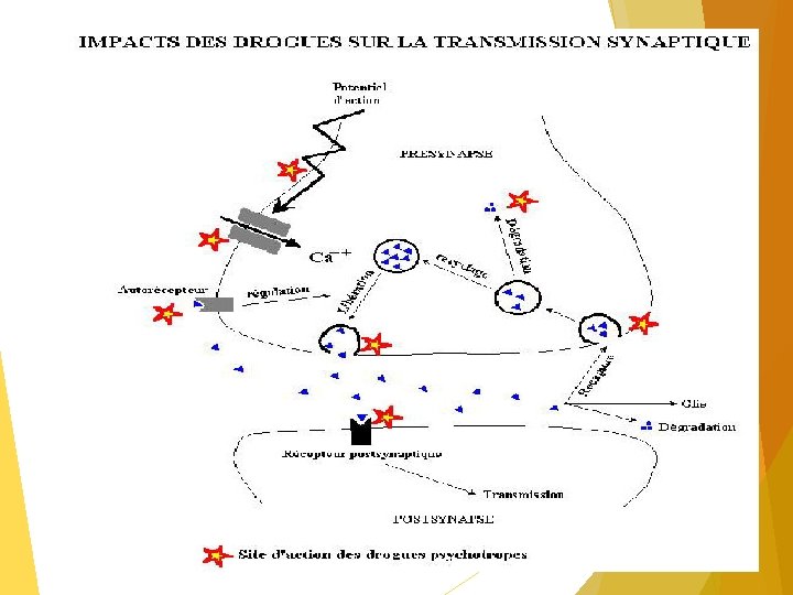 INTRODUCTION Un stupéfiant est une molécule ayant une action hédoniste(qui procure du plaisir) et de la dépendance (ou addiction : état de besoin vis-à-vis d’une drogue ). Quelque soit sa nature chimique ou sa catégorie psychotrope (stimulant, calmant) toute drogue produit son effet en perturbant la transmission de l’influx nerveux entre les neurone Les psychotropes représentent les substances qui altèrent l’esprit se sont des substances psychoactives , agissant sur le SNC, pour la plupart interférent avec la transmission synaptique chimique la drogue s’oppose à la conduction de l’influx nerveux, à l’entrée de calcium dans la pré synapse, elle altère aussi le métabolisme pré synaptique, la libération et la recapture des neurotransmetteurs, enfin un agit sur les récepteurs des neurotransmetteurs et sur leurs systèmes de transduction Les conséquences à long terme des psychotropes est de modifier la réceptivité de la synapse, en modifiant le nombre de récepteur, en réaction de défense, ce qui entraîne l'accoutumance et la dépendance