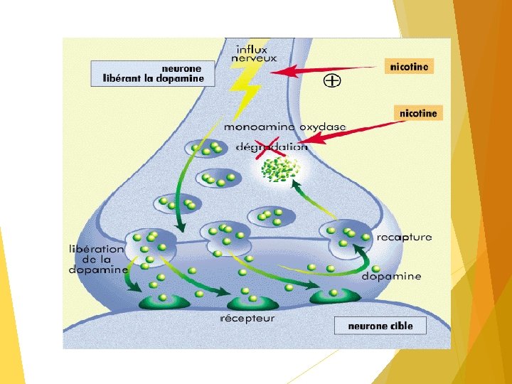 Effet psychostimulant. : La nicotine affecte l’intégralité du système cholinergique cérébrale qui se compose de plusieurs noyaux. La propriété psychostimulante du tabac passe par la stimulation de toutes les structures porteuses de récepteur nicotiniques. Un effet supplémentaire de la nicotine est qu’elle inhibe une enzyme de dégradation des catécholamines (NA, DA, 5 HT) qu’est la monoamine oxydase B. Si cette inhibition ne semble pas jouer un rôle important dans l’addiction nicotinique. Elle renforce la neurotransmission catécholaminergique de l’ensemble du système nerveux et participe, en plus de l’activation du système cholinergique, à l’effet psychostimulant de la nicotine. La nicotine stimule le neurone-présynaptique (influx nerveux) et empêche la destruction de la dopamine après recapture en inhibant la monoamine oxydase