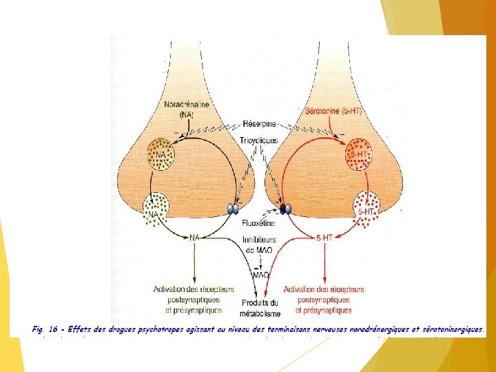Comment les antidépresseurs fonctionnent Des substances chimiques comme la sérotonine, la noradrénaline et la dopamine sont naturellement présentes dans notre organisme. Elles sont nécessaires au fonctionnement normal du cerveau. Chez certaines personnes dépressives, il peut y avoir un déséquilibre de ces substances chimiques (appelées neurotransmetteurs) dans le cerveau. Les antidépresseurs agiraient en rééquilibrant une ou plusieurs de ces substances chimiques. Il y a plusieurs types d'antidépresseurs. Mode d’action des antidépresseurs Les neurobiologistes et les psychiatres supposent aujourd’hui que lors d’une dépression, la quantité des médiateurs chimiques noradrénaline et sérotonine dans la fente synaptique est insuffisante. Après avoir été libérés, ils sont soit rapidement «recapturés» par la cellule nerveuse afin de pouvoir être réutilisés, soit éliminés dans la fente synaptique. Beaucoup d’antidépresseurs agissent en empêchant cette recapture, raison pour laquelle ils sont appelés inhibiteurs