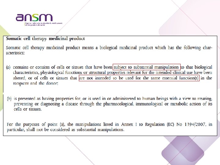 Quelles sont les manipulations non substantielles? D’après le reg 1394/2007 : • Découpage • Broyage • Centrifugation • Sterilisation • Irradiation • Separation, concentration • Cryopréservation, congélation
