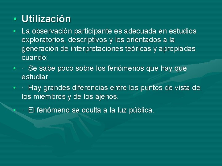 • Utilización • La observación participante es adecuada en estudios exploratorios, descriptivos y los orientados a la generación de interpretaciones teóricas y apropiadas cuando: • · Se sabe poco sobre los fenómenos que hay que estudiar. • · Hay grandes diferencias entre los puntos de vista de los miembros y de los ajenos. • · El fenómeno se oculta a la luz pública.