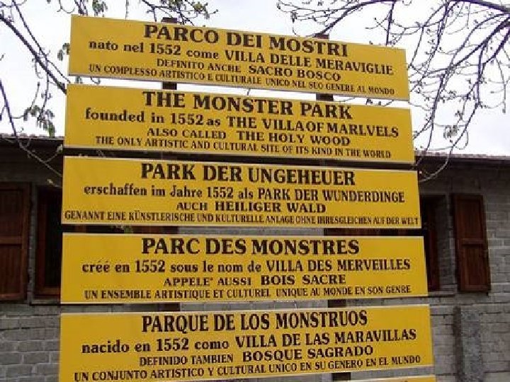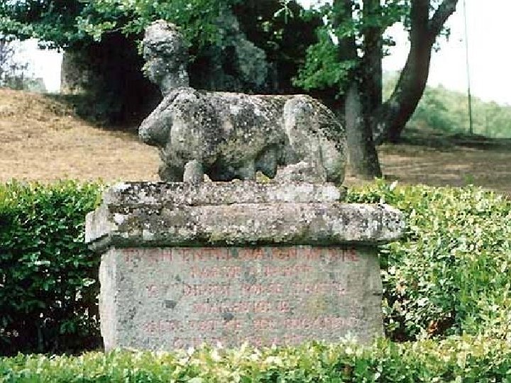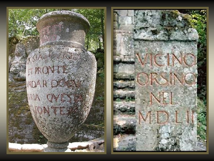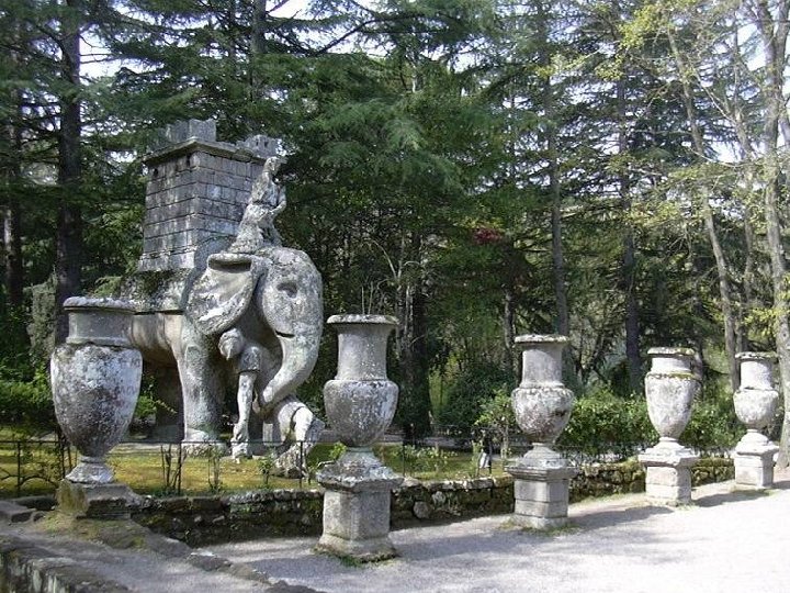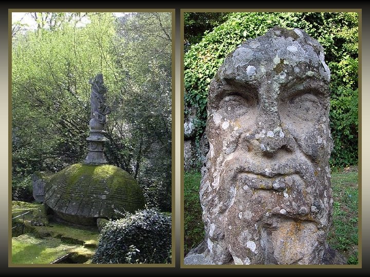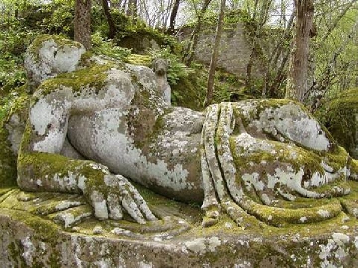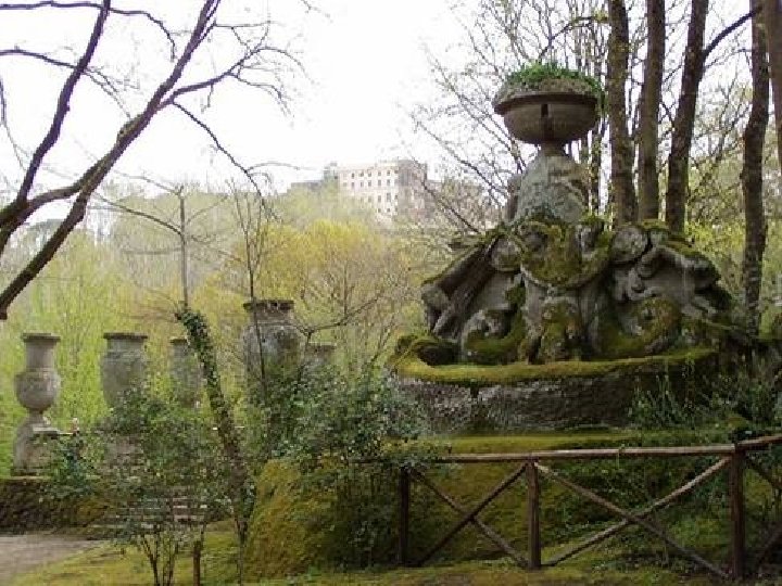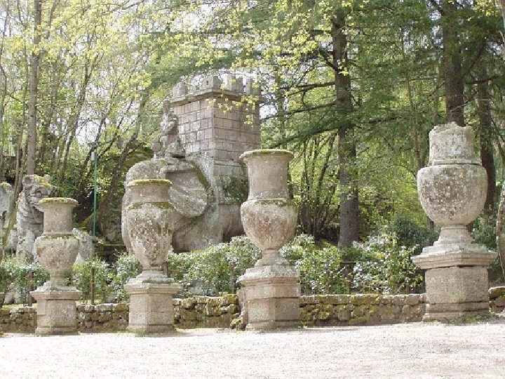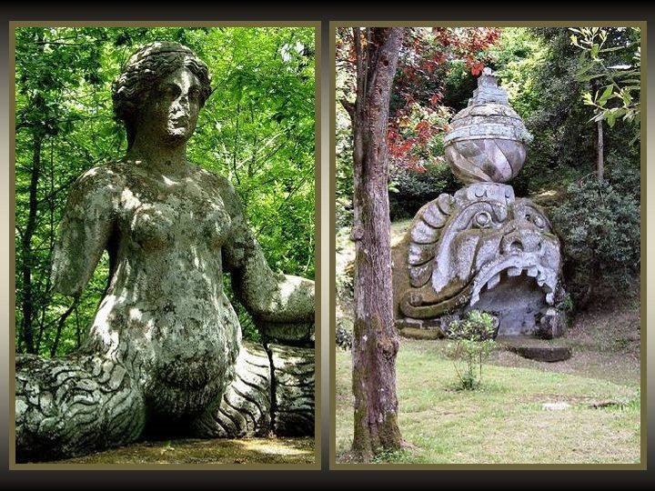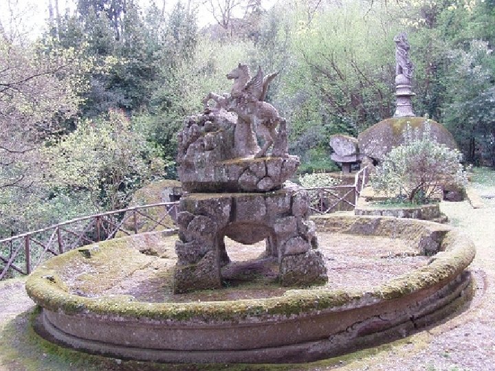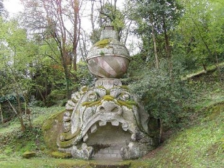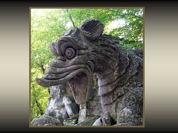 Orsini construyó este parque, rompiendo todas las reglas del arte de su tiempo. Su idea era crear en sus huéspedes una atracción insólita, y con un poco de miedo hacia lo que veían y sentir él “un respiro en su corazón” (era una persona deforme). Creó hace cuatro siglos, increíblemente, un parque surreal y sobrenatural. El dragón Un siglo después de la muerte de Orsini, el parque y su bosque sagrado, como él lo llamaba, cayó en completo abandono y cubierto por la vegetación.