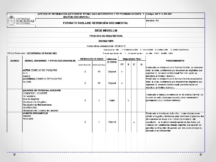 TABLA DE RETENCIÓN DOCUMENTAL § Es el listado de series, subseries y tipos documentales producidos o recibidos por las oficinas, en el que se asigna el tiempo de retención de los documentos, tanto en el archivo de gestión como en el Archivo Central e Histórico. § Es el instrumento de CLASIFICACIÓN y organización de los documentos en cada oficina. § Hace parte del Sistema de Gestión de Calidad.