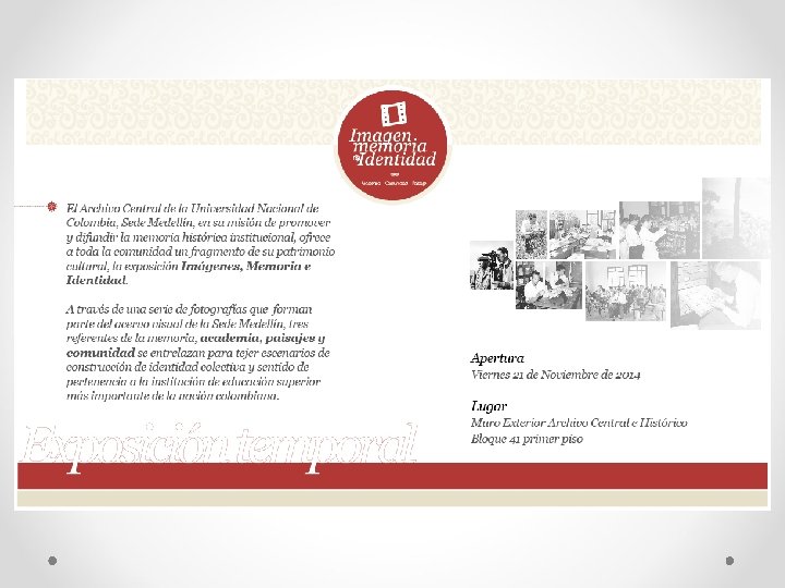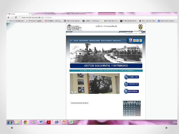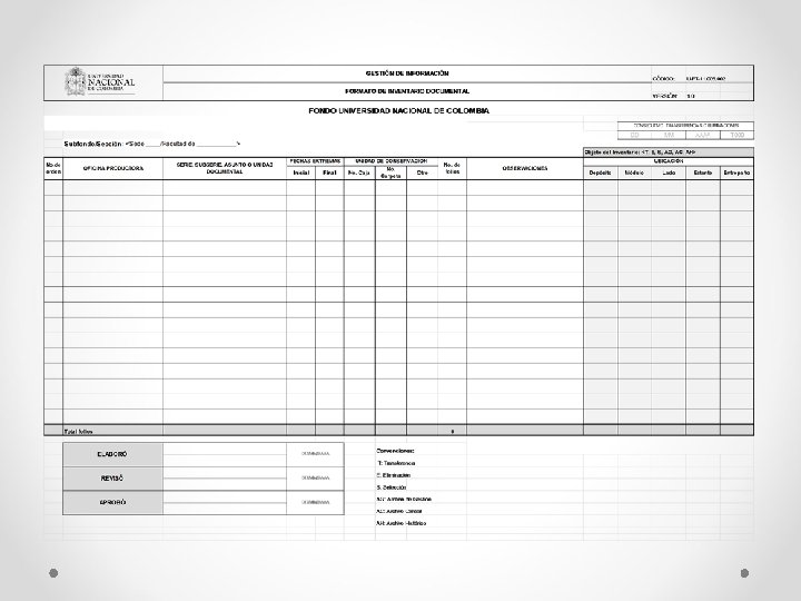 BIBLIOGRAFIA • • • www. archivogeneral. gov. co www. legal. unal. edu. co/sisjurun/normas/Norma 1. jsp? i=46704 UNIVERSIDAD NACIONAL DE COLOMBIA. UNIDAD NACIONAL DE ARCHIVO. Guías de series documentales. Bogotá : Unal, 2005 ---- Tabla de Retención Documental : Guía para su aplicación. Bogotá : Unal, junio 2002 ---- Resolución de Rectoría No. 385 por la cual se crea el Sistema de Archivos y fija políticas documentales en la Universidad. Bogotá : la Unal, marzo 31 de 2003 ---- Resolución de Rectoría No. 386, por la cual se expide el Reglamento General de Archivo de la Universidad. Bogotá : Unal, marzo 31 de 2003 ARCHIVO GENERAL DE LA NACIÓN. Tablas de retención y transferencias documentales : Directrices básicas e instructivo para su elaboración/ División de Clasificación y Descripción. Bogotá: AGN, 1997. 88 p ---- Gestión Documental : bases para La elaboración de un programa. Bogotá: AGN 2004 ---- Reglamento General de Archivos. Bogotá : AGN 2003