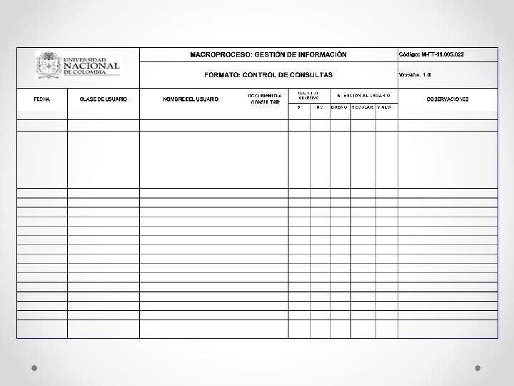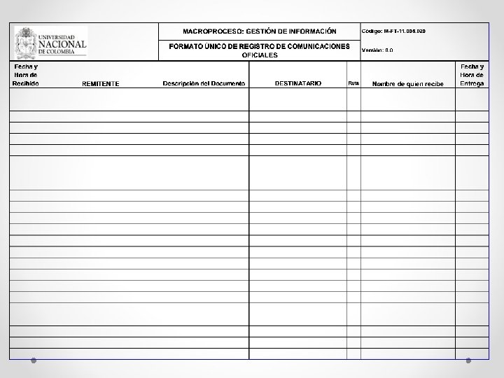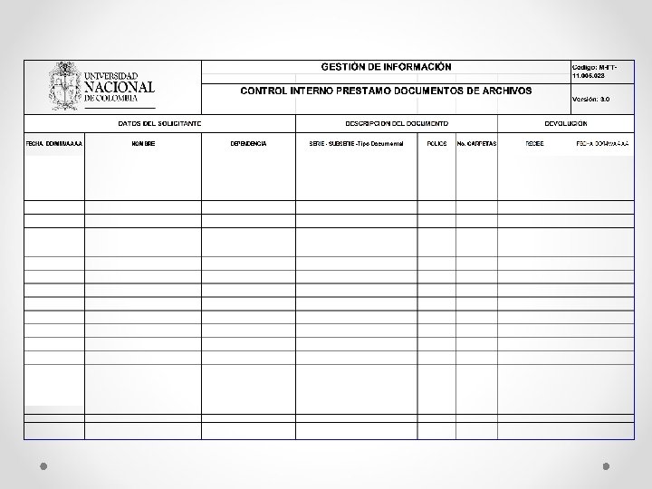 los Archivos de Gestión Formato único de Inventario documental (FUI) Utilizado para las transferencias, eliminaciones , archivos de gestión Central e histórico , en el se refleja por unidad documental(carpeta) la información requerida Formato de préstamo y control documental Utilizado para registrar los préstamos realizados o las consultas que se lleven a cabo de los documentos producidos. Formato de Comunicaciones Oficiales. Utilizado para registrar las comunicaciones recibidas o despachadas de las dependencias de la universidad