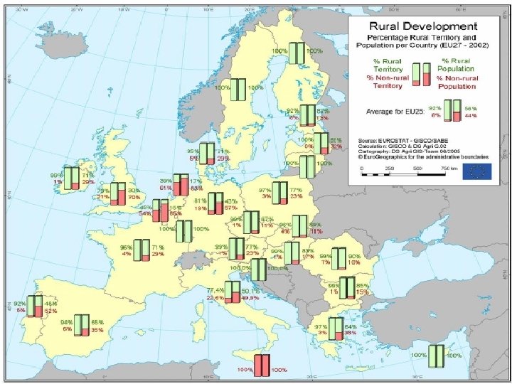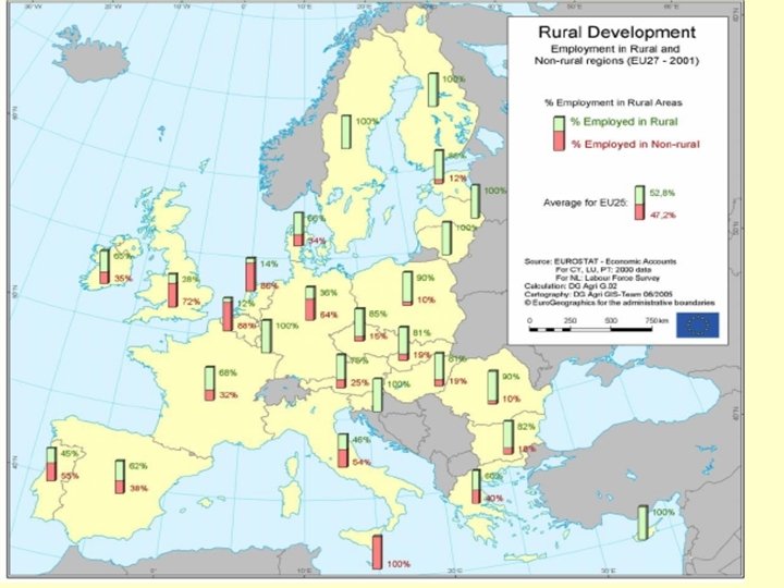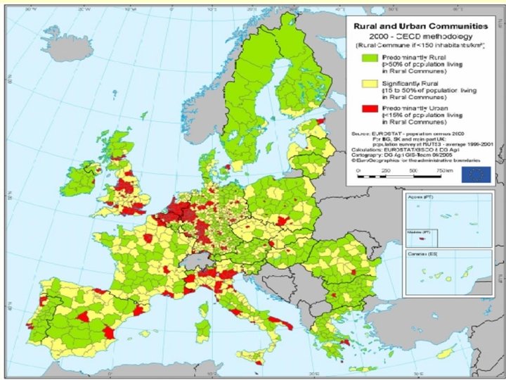 4) EL FUTURO DE LA PAC 4. 1) La importancia del desarrollo rural Según la definición de la OCDE, que se basa en la densidad de población, las regiones rurales representan el 92 % del territorio de la UE. Un 19 % de la población de la Unión Europea vive en regiones predominantemente rurales, y un 37 % en regiones significativamente rurales. Estas regiones generan el 45 % del valor añadido bruto (VAB) y el 53 % de los puestos de trabajo de la UE.