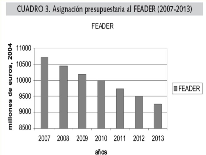Nuevo Fondo centrado en el Desarrollo Rural Reglamento (CE) no 1698/2005 del Consejo, de 20 de septiembre de 2005, relativo a la ayuda al desarrollo rural a través del Fondo Europeo Agrícola de Desarrollo Rural (Feader). El FEADER contribuirá a la promoción de un desarrollo rural sostenible en toda la Comunidad como complemento de las políticas de apoyo al mercado y a los ingresos aplicadas en el marco de la política agrícola común, la política de cohesión y la política pesquera común (art 3). El FEADER financiará, en gestión compartida entre los Estados miembros y la Comunidad la contribución financiera de la Comunidad en favor de los programas de desarrollo rural realizados de conformidad con la legislación comunitaria