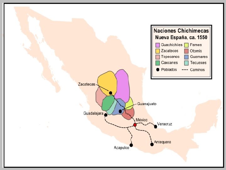 Primeros pobladores • Las diversas tribus chichimecas que habitaban en el territorio zacatecano fueron los caxcanes, guachichiles, guamares, irritilas, huicholes, tecuexes, teules, tepehuanes, coras y zacatecos. Huicholes tepehuanes