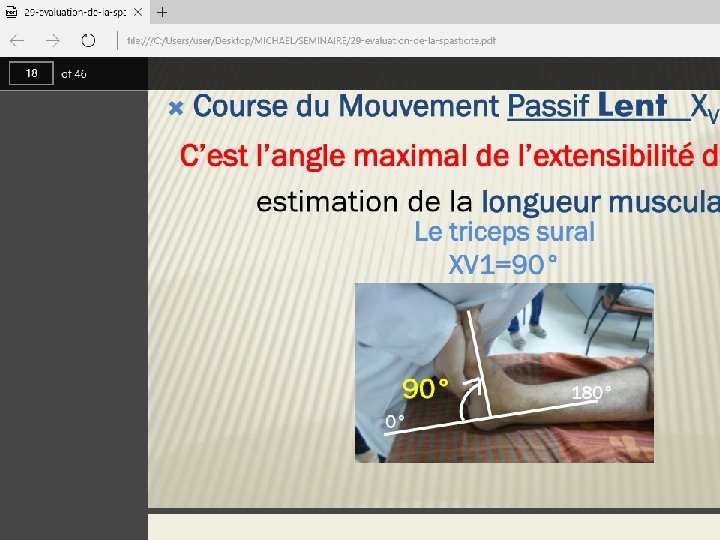 Calcul de l´angle de spasticité v L´Angle de spasticité : X Nécessite de déterminer 2 angles: o Xv 1: Angle maximal d'extensibilité du muscle en course passive lente. o Xv 3: Angle de déclenchement de la spasticité en course passive rapide: l´angle de ressaut