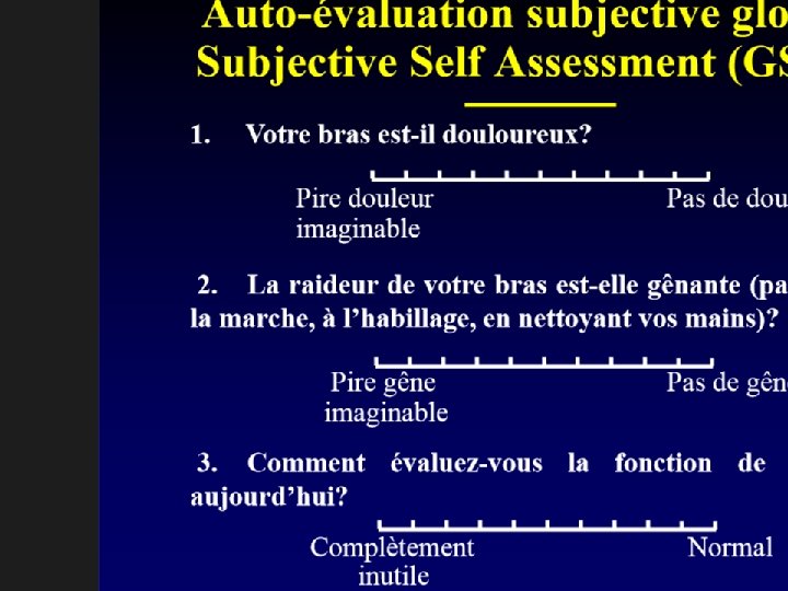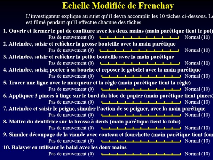 Echelle modifiée de Frenchay q Modifiée à partir du Frenchay Arm Test (Wade et al, 1983): évaluation de 7 tâches du mb sup dont 5 uni manuelles. q. Augmentation tâches bi manuelles : 6 parmi 10 tâches fonctionnelles, pour mieux représenter les situations quotidiennes réelles.