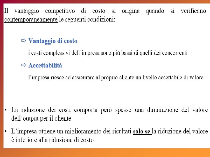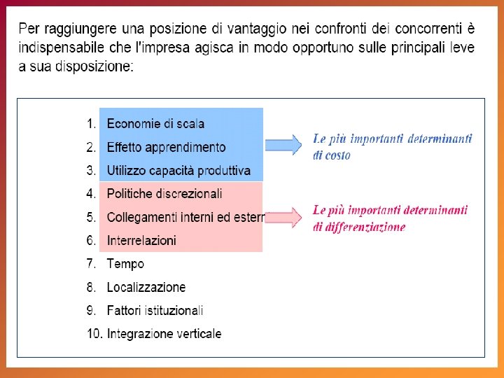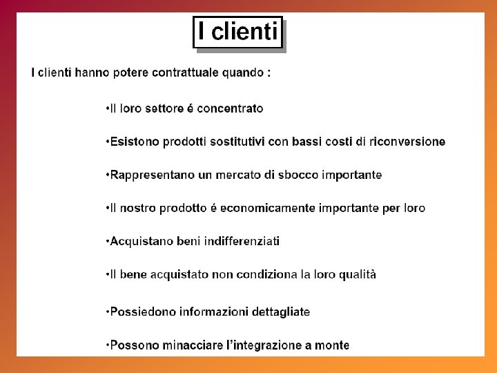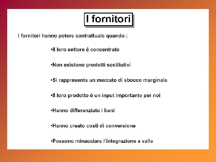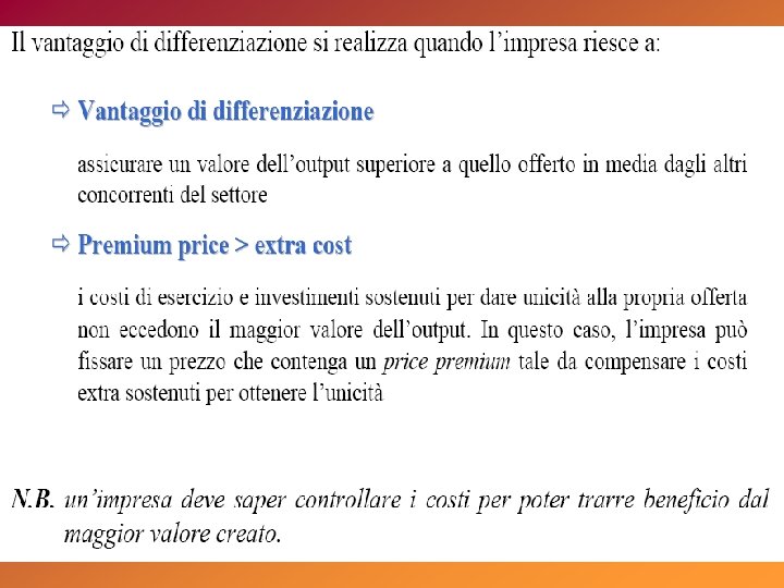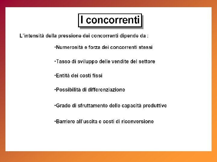 alto STAR basso tasso di crescita del mercato (%) La matrice del Boston Consulting Group (BCG) QUESTION MARK Utili: elevati in stabile crescita Utili: bassi, instabili, in crescita Flussi di cassa: neutri Strategia: investire nella crescita Flussi di cassa: negativi Strategia: analizzare il business CASH COW DOG Utili: alti, stabili Utili: bassi, instabili Flussi di cassa: alti, stabili Strategia: mungere Flussi di cassa: neutri o negativi Strategia: disinvestire alta bassa quota di mercato relativa