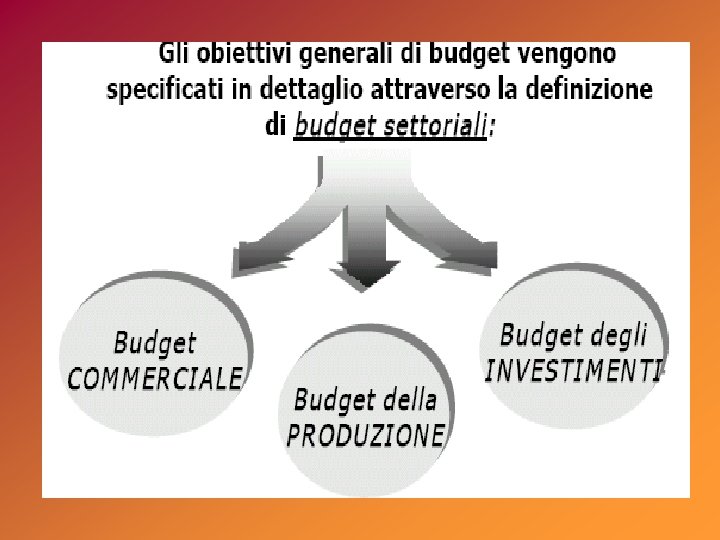 Funzioni del BUDGET : • guida e orientamento delle attività operative • motivazione per il raggiungimento degli obiettivi • coordinamento dei vari organi d’impresa • valutazione della performance di periodo