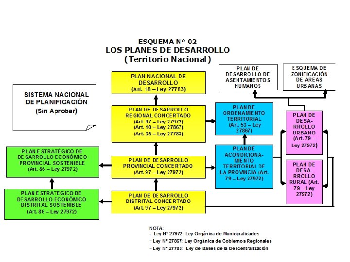LEY ORGÁNICA DE MUNICIPALIDADES Ley N° 27972 ATRIBUCIONES DEL CONCEJO MUNICIPAL ART. 9°. Dentro de las atribuciones del Consejo Municipal corresponde: • Aprobar el Plan de Acondicionamiento Territorial de nivel provincial. • Aprobar el Plan de desarrollo Urbano, el Plan de Desarrollo Rural , el Esquema de Zonificación de áreas urbanas, el Plan de Desarrollo de Asentamientos Humanos y demás planes específicos sobre la base del Plan de Acondicionamiento Territorial.