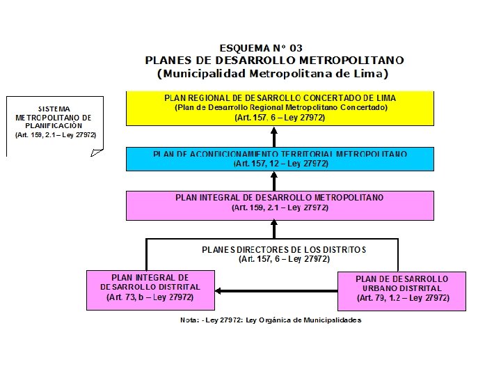 LA GESTIÓN DE LOS PLANES DE DESARROLLO METROPOLITANO SISTEMA METROPOLITANO DE PLANIFICACIÓN (Art. 159, 2. 1 – Ley 27972) PLAN REGIONAL DE DESARROLLO CONCERTADO DE LIMA (Plan de Desarrollo Regional Metropolitano Concertado) (Art. 157, 6 – Ley 27972) PLAN DE ACONDICIONAMIENTO TERRITORIAL METROPOLITANO (Art. 157, 12 – Ley 27972) La Asamblea Metropolitana actuando como Consejo de Coordinación Regional La Junta de Planeamiento Metropolitano PLAN INTEGRAL DE DESARROLLO METROPOLITANO (Art. 159, 2. 1 – Ley 27972) La Junta de Cooperación Metropolitana y las Juntas Interdistritales de Planeamiento PLANES DIRECTORES DE LOS DISTRITOS (Art. 157, 6 – Ley 27972) PLAN INTEGRAL DE DESARROLLO DISTRITAL (Art. 73, b – Ley 27972) Nota: - Ley 27972: Ley Orgánica de Municipalidades PLAN DE DESARROLLO URBANO DISTRITAL (Art. 79, 1. 2 – Ley 27972)