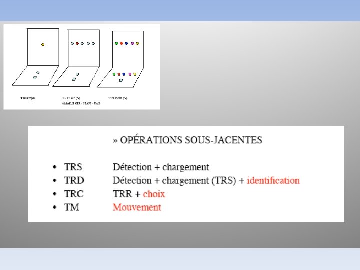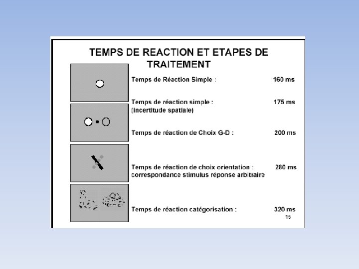 Temps de réaction • Temps de réaction: temps écoulé entre la présentation d’un stimulus et le début de la réponse motrice. • TR simple: environ 200 ms