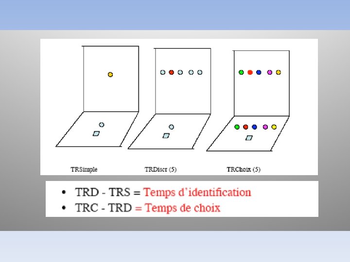 Temps de réaction • Nombre de choix stimulus-réponse. • Loi de HICK (1952): TR de choix augmente de façon constante à chaque fois que l’on double le nombre d’alternatives (2, 4, 8, 16. . ) N. B. : chez le sujet non entraîné à la tâche.