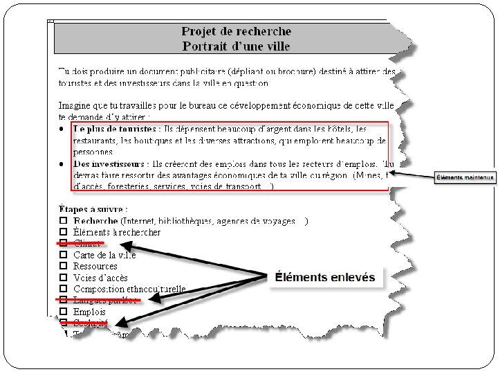 À la lumière de la 1 re partie de la démarche, réviser la tâche A pour : • maintenir ce qui a été ciblé dans le programme- cadre; • ajouter les éléments qui sont manquants; • enlever les éléments superflus.