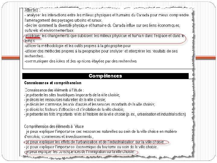 Avant Après (dans les mots de l’élève) Domaine – Perspectives mondiales - A 1 Décrire comment la diversité physique et humaine du Canada influe sur ses liens économiques, culturels et environnementaux. - C 2 Expliquer l’attrait qu’exerce la nature canadienne sur les touristes étrangers (p. ex. , loisirs, sports, recherche des grands espaces, beauté du paysage) et les retombées économiques de ce tourisme. - C 3 Analyser les causes de l’immigration au Canada (p. ex. , facteurs d’incitation et d’attraction) et les conséquences de cette immigration sur les régions canadiennes. Compétence Connaissance et compréhension - Je peux expliquer l’importance économique du tourisme au sein de la ville étudiée. Domaine : Changements -A 1 Expliquer les changements que subissent les milieux physique et humain dans l’espace et dans le temps. Milieux physique et humain - C 2 - Décrire les grands facteurs de transformation de la société canadienne (p. ex. , immigration, urbanisation, industrialisation, mondialisation). - C 3 - Expliquer les changements occasionnés par le multiculturalisme et les raisons pour lesquelles le respect des différences. Compétence Connaissance et compréhension - Je peux expliquer les effets de l’urbanisation et de l’industrialisation sur la ville étudiée; - Je peux expliquer les conséquences de l’immigration sur la ville étudiée.