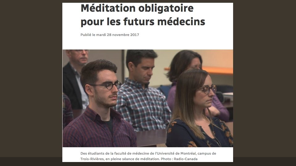 Références • Audet, N. , Lussier, M. , Rose, D. et Pontbriand, F. (2011). Guide de travail académique de résidence, résidents 1 en médecine familiale. Laval : Université de Montréal. • Baraldie, R. , Joubert, K. et Bordeleau M. (2015). Portrait statistique de la santé mentale des Québécois. Résultats de l’Enquête sur la santé dans les collectivités canadiennes — Santé mentale 2012. Québec : Institut de la statistique du Québec. • Bondolfi, G. , Jermann, F. , der Linden, M. V. , Gex-Fabry, M. , Bizzini, L. , Rouget, B. W. , … Bertschy, G. (2010). Depression relapse prophylaxis with Mindfulness-Based Cognitive Therapy: Replication and extension in the Swiss health care system. Journal of Affective Disorders, 122(3), 224– 231. • Bouchard, M. (2017). Méditation obligatoire pour les futurs médecins. Ici : Radio-Canada. https: //ici. radiocanada. ca/nouvelle/1069943/etudiants-medecine-meditation-mindfuness-universite-de-montreal-trois-rivieres-mauricie • Godfrin, K. A. , & Van Heeringen, C. (2010). The effects of mindfulness-based cognitive therapy on recurrence of depressive episodes, mental health and quality of life : A randomized controlled study. Behaviour Research and Therapy, 48(8), 738 -746. • Huijbers, M. J. , Spinhoven, P. , Spijker, J. , Ruhé, H. G. , Van Schaik D. , Van Oppen, P. , … Speckens A. (2015). Adding mindfulness-based cognitive therapy to maintenance antidepressant medication for prevention of relapse/recurrence in major depressive disorder : Randomised controlled trial. Journal of Affective Disorders, 187(15), 54 -61.