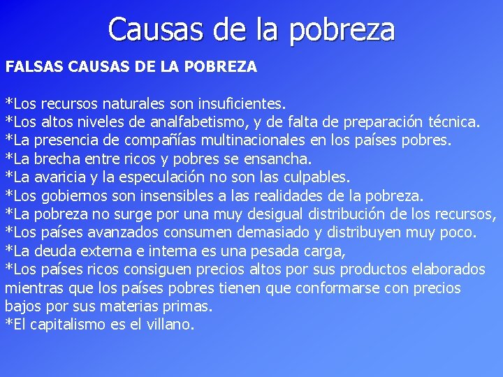 Causas de la pobreza FALSAS CAUSAS DE LA POBREZA *Los recursos naturales son insuficientes. *Los altos niveles de analfabetismo, y de falta de preparación técnica. *La presencia de compañías multinacionales en los países pobres. *La brecha entre ricos y pobres se ensancha. *La avaricia y la especulación no son las culpables. *Los gobiernos son insensibles a las realidades de la pobreza. *La pobreza no surge por una muy desigual distribución de los recursos, *Los países avanzados consumen demasiado y distribuyen muy poco. *La deuda externa e interna es una pesada carga, *Los países ricos consiguen precios altos por sus productos elaborados mientras que los países pobres tienen que conformarse con precios bajos por sus materias primas. *El capitalismo es el villano.