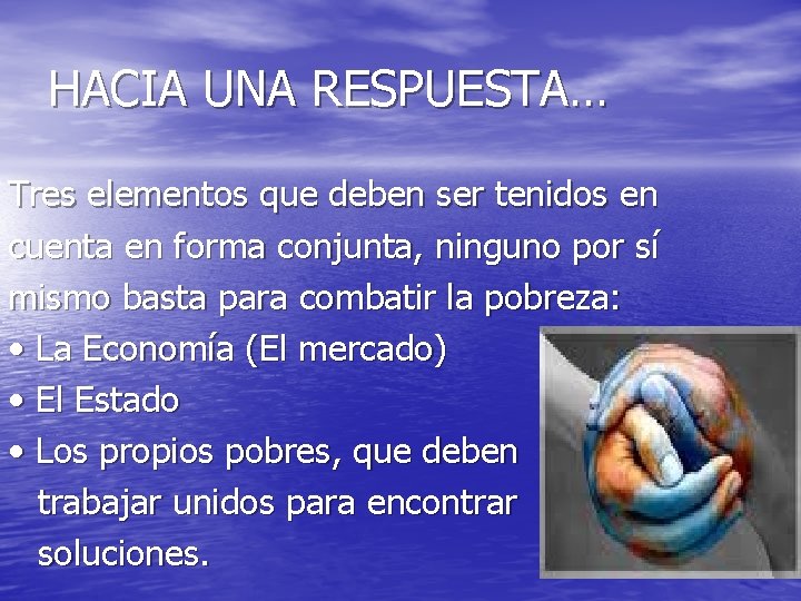HACIA UNA RESPUESTA… Tres elementos que deben ser tenidos en cuenta en forma conjunta, ninguno por sí mismo basta para combatir la pobreza: • La Economía (El mercado) • El Estado • Los propios pobres, que deben trabajar unidos para encontrar soluciones.